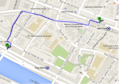 Take tramway T3b to Porte de Vincennes , get out at the end. Take the metro line 1 (direction La defense) get at out at stop Saint-Paul. You need two tickets (one for tram and another for metro)
